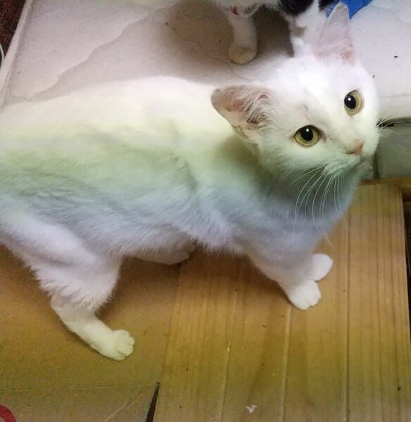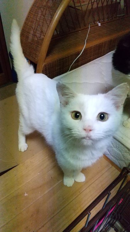 | 特徴(性格など) | 全身真っ白です。 人懐こくて甘えん坊です。 誰にでもベタベタすりすりします。 保護時には酷い皮膚炎でしたが良くなっています。 ミャーミャー、良くお話をします。 とにかく人が好きで 先住犬猫にも慣れています。 |