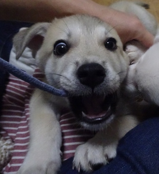 | 特徴(性格など) | 2022年9月中旬生まれの子犬「はると」です。 1回目ワクチン接種済(2回目は12月20日頃の予定)、回虫駆除中、未去勢。 犬の飼育本に出てくるやんちゃな子犬そのものです。 一緒に仮宿生活中の兄弟犬「コツメ」とよく遊び、よく食べ、よく寝てスクスク成長中の健康優良児です。 月齢約2ヵ月半で5キロありますので、将来は大きくなると思われます。 性格は非常に活発でやんちゃ男子ですが甘えん坊でもあります。 オヤツを使ってのお座りはあっという間に覚えました。人に集中出来るコなので、上手にしつけてあげれば多くのことを学習するかと思います。 今は3食のご飯に対してウンチを日に5~6回、おしっこは十数回します。 下記ブログにて日常の様子を紹介していますのでご覧になって下さい。 まだ幼いので留守番がなるべく無く(少なく)、たくさんの愛情をかけて下さるご家庭を希望します。 ●預かりブログ https://blog.goo.ne.jp/tkshrk1013 |