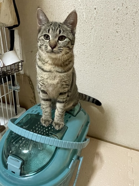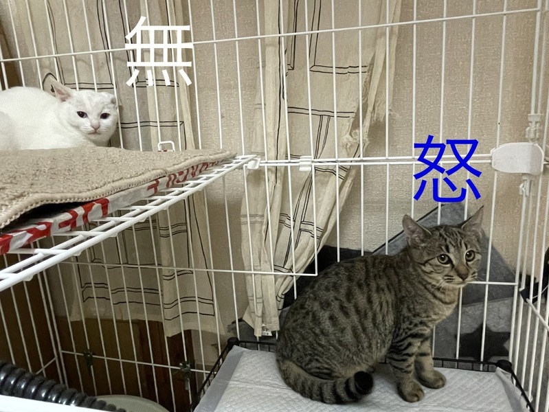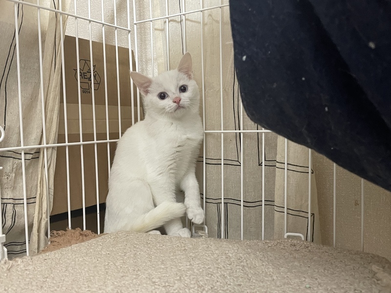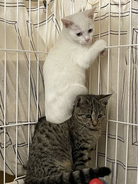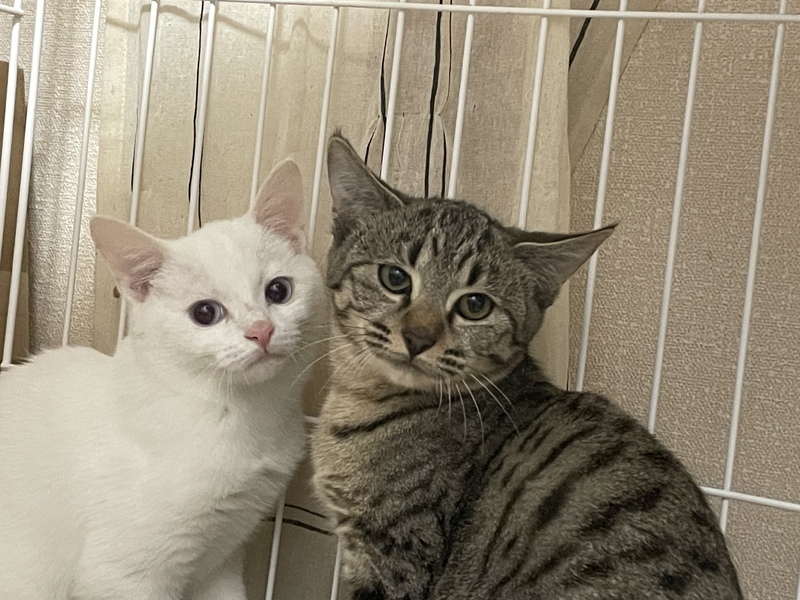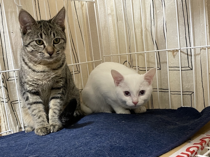 | 特徴(性格など) | 姉キジトラ、弟シロ猫さんです。 キジトラはイカ耳卒業で、猫じゃらしで遊ぶようになりました。 シロ猫は警戒心が強く、まだまだイカ耳になりますが、ご飯の時は可愛い声で鳴いています。 2匹とも猫エイズ 白血病 陰性です 12/10キジトラさんトライアル中です。 |