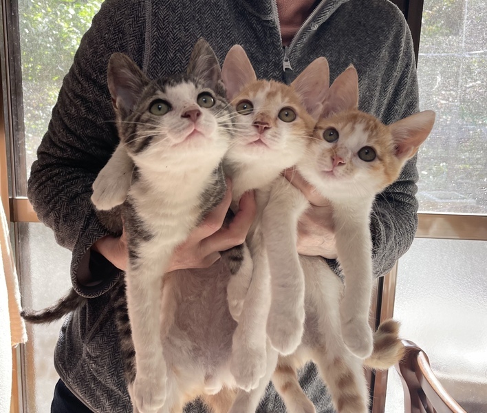| 特徴(性格など) | 生後3ヶ月 とても元気いっぱいの兄弟です。 トイレトレーニング済みです。 〜性格〜 黒白の子(オス) 兄弟の中で1番人懐っこく甘えん坊です。 茶白の子(オス)写真一枚目真ん中の子 1番体格が良く、よく食べよく遊びます。 茶白の子(オス)写真一枚目右の子 最初は人見知りですが、すぐに慣れます。 3匹とも良好で、ノミ・ダニ駆除済みです。 |