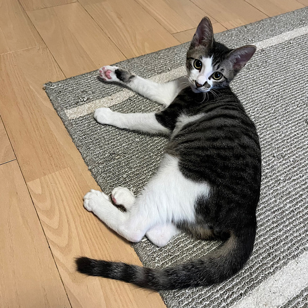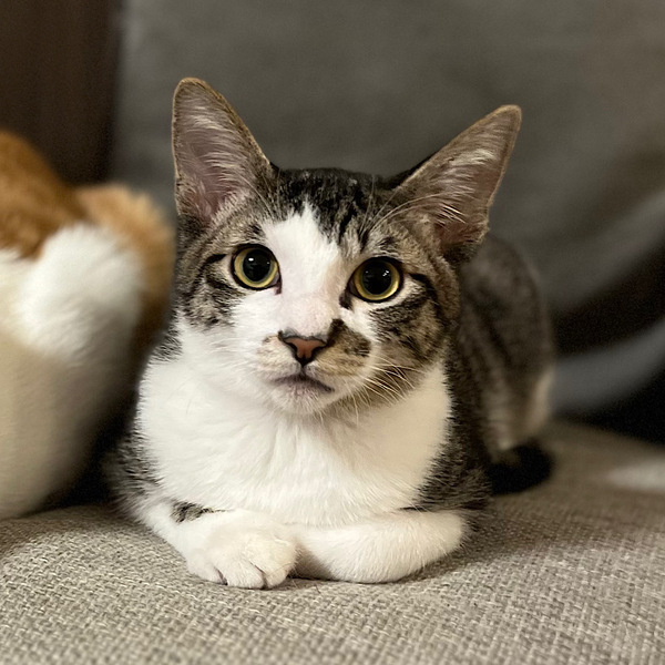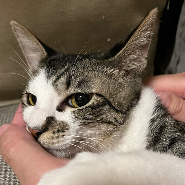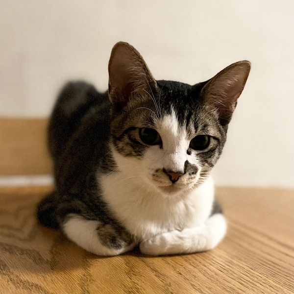| 特徴(性格など) | ホクロのような模様がチャームポイント!よく食べよく遊ぶ元気な男の子です。よくうにゃうにゃとおしゃべりをしています。近頃はカーペットの下に潜り込んでのうにゃうにゃがお気に入りです。 いつも他の猫の側にいたがるので、寂しがりな性格なのかも?人間にもうまく甘えられるように、たくさん遊んであげて下さい。 とても好奇心旺盛で食べ物への執着が強めですので、キャットフードの保管は厳重にお願いします。うっかりするとストックが空になります。 |