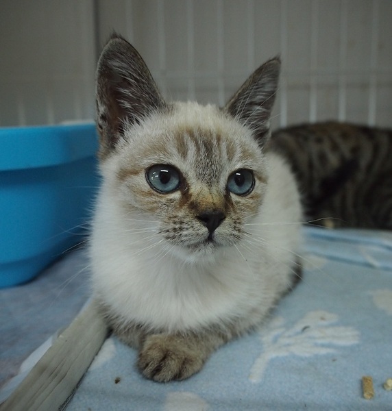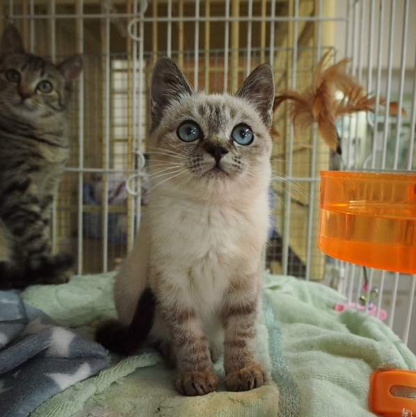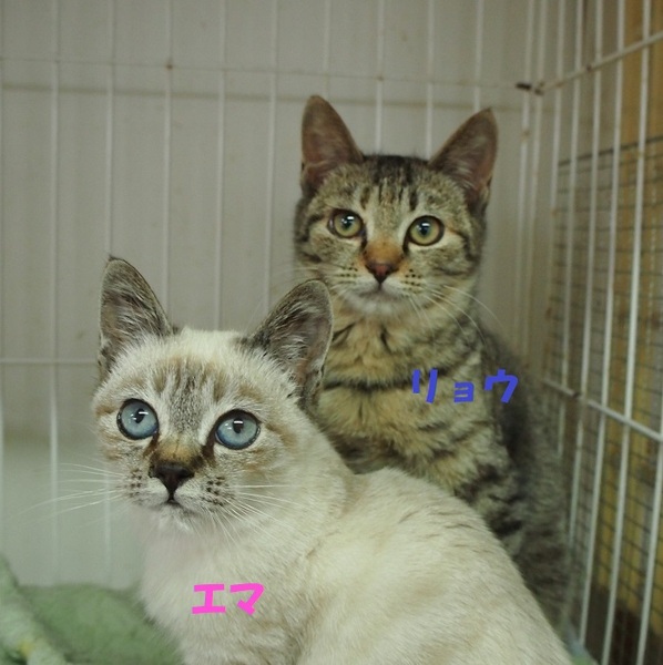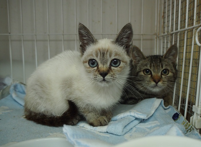 | 特徴(性格など) | シャムミックスのエマちゃんは女の子で、まったく人見知りをせず人が大好きなとっても可愛い子です。 まだ小さくてワクチンとウイルスチェックをしていませんが、元気です。 キジトラのリョウ君は、男の子で、まだ少々ビビっています。 リョウ君はワクチンを接種済みです。ウイルスチェックの結果は、エイズ白血病ともに陰性でした。 2匹とも大人しくてとても良い子です。 |