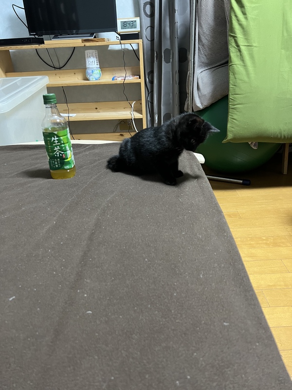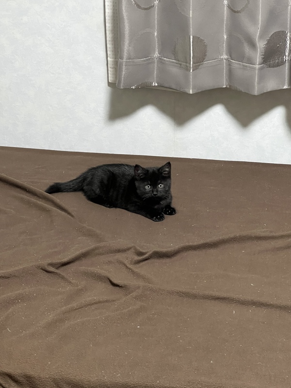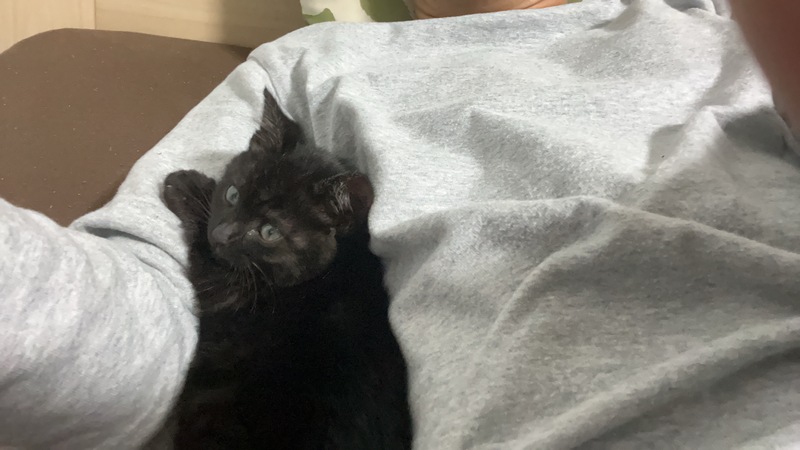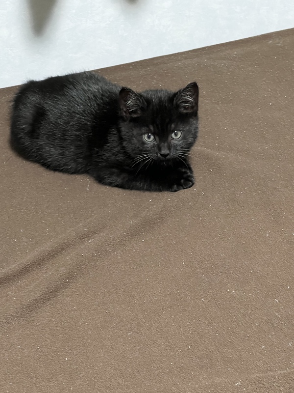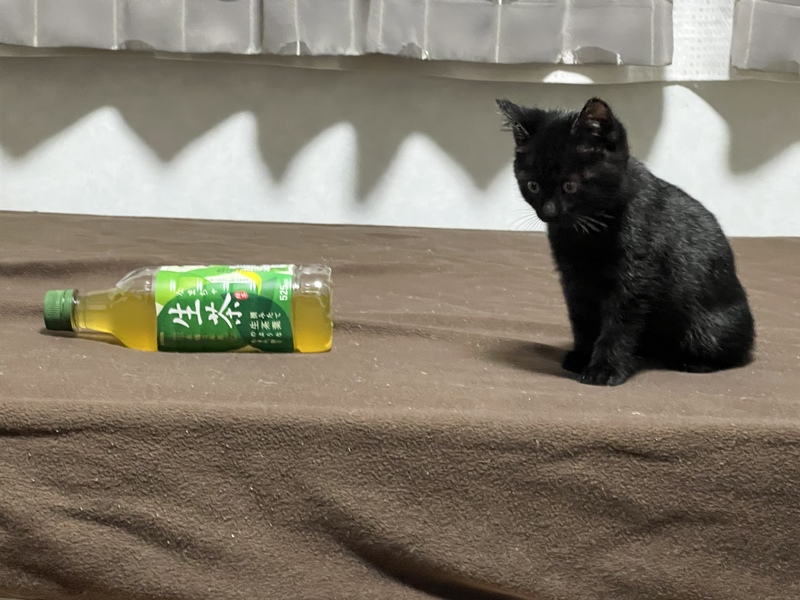 | 特徴(性格など) | 保護猫です。3週間前ほどに保護してます。黒猫のオスです。甘えん坊で自分がテレビを観ていると構ってほしいのか顔の前にきたら、テレビなら映像に猫パンチしてりして、邪魔をします。 ミルクは卒業してウェットの餌を好みますごドライの餌もたべます。 大きさは500のペットボトルを比較対象にしています。 |