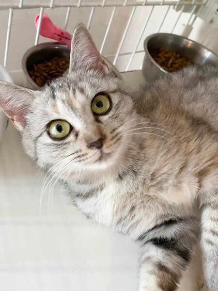 | 特徴(性格など) | 物静かで穏やかな甘えっコ「ミミ」ちゃん❤ 抱っこも玩具で遊んで貰うのも穏やかに付き合ってくれる♪ 目が合うとスリスリ甘えてきてくれる甘え上手♪ お腹ナデナデ大好きなお嬢さまです。 現在、ドライフードを24時間の置き餌として栄養補給、水分補給のため一日2回パウチを与えています。 <推定誕生日:2021年4月ごろ> |