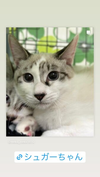 | 特徴(性格など) | 【仮名】シュガー 【月齢】2022.7月頭生まれくらい 【性別】メス ◆水色の瞳がとても美しい女の子です 元気いっぱい走りこんだり 高いところにジャンプしたり。 サッカーも大好き! 男の子?って思うような活発な女の子です。 ラグドール?と思わせるような淡い毛色です。 成長に伴い、変わっていく楽しみがありますね♪ |