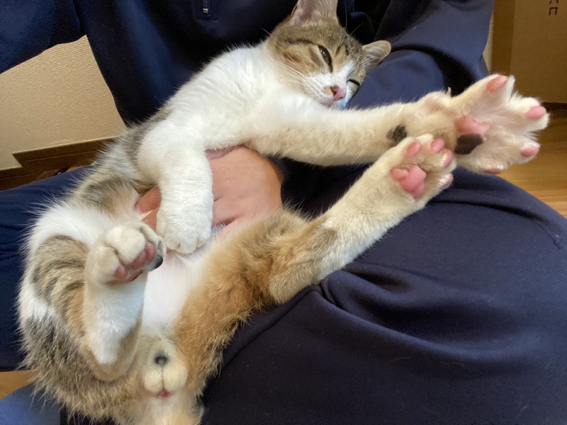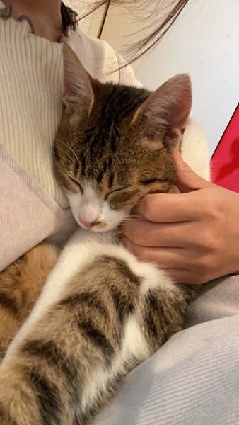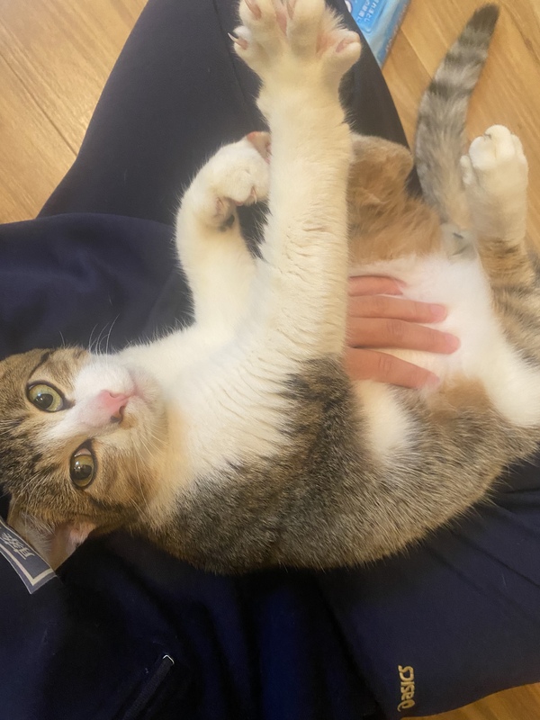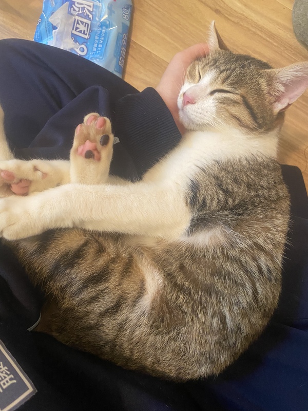 | 特徴(性格など) | 性格はとても人懐っこく甘えん坊です。 私が拾った際も、ずっと跡をついてくるほど人間が大好きな男の子です。 膝の上にのるのが大好きで、抱っこするといつも寝ています。 |