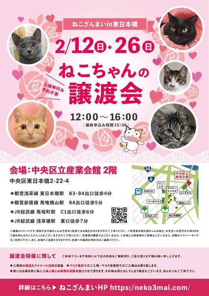 | その他(譲渡条件など) | 11:30より、2階会場入口にて受付を開始します。 受付時に入場予定時間が記入された整理券をお配り致しますので、整理券を受け取った方はお時間になりましたら2階会場入口に番号順にお並び下さい。 ※11:30より早くいらしてもお待ちいただく場所がございません。 また、近隣にお住まいの方や他階フロアのご利用者様にご迷惑となる場合がございますので、受付開始時間にあわせてお越しくださいますよう、何卒ご協力お願いいたします。 ※ねこざんまい譲渡会は、先着順で里親様を決定する譲渡会ではありません。 先に申し込みをした方を優先することもありません。 お話をして、その猫ちゃんに合ったおうちに決めさせていただいております。 12時に開場し、里親様の決定は14時以降となります。 14時以降にご入場の場合、希望の猫ちゃんが決定している可能性があります。 また1頭に対し多数のご希望をいただいた場合、早めに申し込みを締め切らせていただく場合がございますので、予めご了承下さい。 里親様決定は14時以降となります。 その後、迎え入れ準備の説明等のお時間も頂戴しますので、お時間に余裕を持ってご来場下さい。 【新型コロナウィルス感染予防対策について】 譲渡会開催に際し、ご来場下さいます皆様には以下の内容をご理解頂き、ご協力頂けます様お願い申し上げます。 ●入場前の検温とアルコール消毒の実施 ●マスク着用でのご入場=マスク未着用でのご入場はお断り致します ●入場人数の制限をさせていただきます(来場多数の場合は入れ替え制となります) ●時間と人数の制限=密になる事を防ぐ為に入場人数とお時間の制限を設けさせて頂きます その為お待たせしてしまう場合もございます ●会場利用規約により、ご来場者様の連絡先を控えさせていただきます あらかじめご了承下さい。 諸々の制限がございますが、安心・安全な譲渡会運営のためにご理解・ご協力いただきますようお願い申し上げます。 ~~~~~~~~~~~~~~~~~~~~~~~~~~~~~~ ★仔猫ご希望の里親様★ 仔猫ちゃんたちは、まだ体がしっかりしていない赤ちゃんです。 下痢だけでも数時間対応ができなかっただけ死に至る事もあります。 その為、月齢に応じたお留守番時間を設けさせていただいております。 また、子猫ちゃん(6ヶ月未満)の里親様には子猫支援金のご協力をお願い致しております。 ★猫ちゃんとのお見合いは譲渡会で!★ ねこざんまいの猫ちゃんは譲渡会でのお見合いのみとなります。 『この子はいつ譲渡会に参加するの?』『譲渡会場の場所はどこ?』などは、ねこざんまいホームページをご覧ください。 https://neko3mai.com/ ★楽しく猫ちゃんと触れ合って★ ねこざんまい譲渡会は、猫ちゃんも里親様も保護主も笑顔で過ごせる譲渡会を目指しています。 これから20年以上、楽しい時も、悲しい時もいつも傍にいてくれる大切な家族になる猫ちゃんです。 会場には沢山の猫ちゃんがいます。 1匹1匹、触れ合って猫ちゃんとお話してください。 『初めて猫ちゃんを家族に迎える方』 『先住猫ちゃんのお友達を迎える方』など トライアルの仕方や先住猫ちゃんと仲良くなるコツなど経験豊富な保護主やスタッフにお気軽にご相談ください! 猫を愛し、そして猫に愛されている猫好きスタッフと保護主がアドバイスさせていただきます。 ★里親希望のみなさまへ★ ペットではなく、家族一員としてたっぷり愛情を注いでくださるご家庭をお待ちしております。 恐れ入りますが ●学生の方、子猫・幼猫希望の60才以上の方のみのご家庭 ●脱走防止対策にご協力いただけない方 は原則譲渡を遠慮させていただいております。 ●一人暮らし・同棲(事実婚)の方 保護主の希望や猫の年齢・性格等により、ご希望に添えない場合もございます。 参加猫ちゃんは、それぞれ保護主(実際に猫ちゃんを自宅に入れ、保護をしている方)が異なります。 詳しい条件なども異なる場合がございますので、会場内で直接保護主とお話ください。 〖共通条件〗 1.終生飼育 2.完全室内飼い 3.脱走防止対策へのご協力 4.避妊去勢手術 5.契約書類へのサイン 6.定期報告 7.医療費等の負担 当日の猫ちゃんを連れて帰ることはできません。後日、保護主が里親様のご自宅までお届け致します。 その為、移動の際の猫ちゃんの負担を月齢などから考慮し、お届け地区を限定させて頂くこともございますのでご了承ください。 ご理解とご協力のほど宜しくお願い致します。 ☆よくある質問☆ ・譲渡の条件 ・ご負担頂く費用 ・譲渡会の場所等は ホームページに詳しく掲載させて頂いておりますのでご覧ください。 https://neko3mai.com/ メールでのお問い合わせはすぐにご返答出来ない場合がございますのでご了承ください。 ホームページ https://neko3mai.com/ お問い合わせ http://www.neko3mai.com/contact/form_general.html ねこざんまいブログ http://ameblo.jp/neko3mai/ |