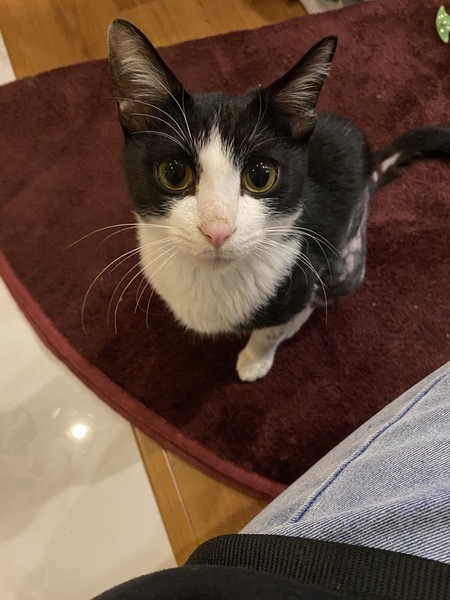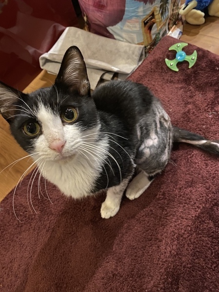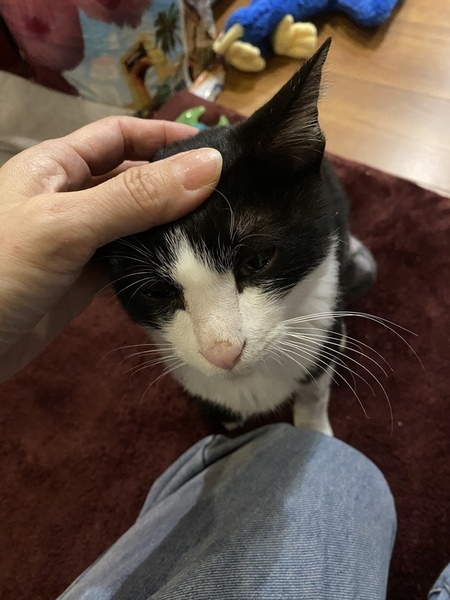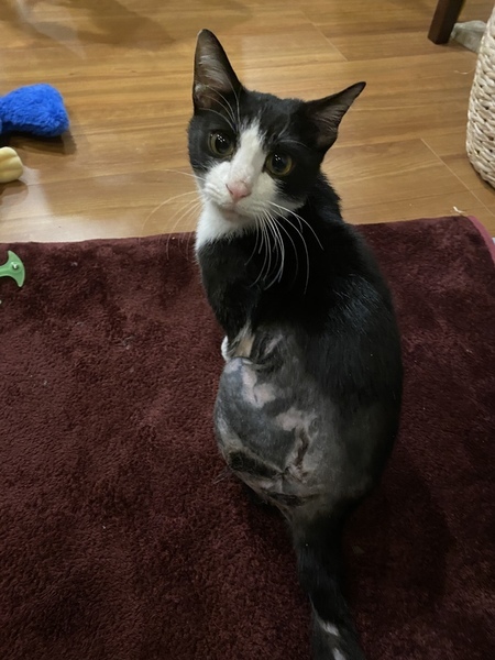 | 特徴(性格など) | 白黒の野良猫ちゃん。 罠に引っかかった様で体の半分の毛が抜けています。 残った毛にノリの様な物が付いており無理矢理自分で罠から抜けた際、毛も一緒に引きちぎったと思われます。 初めは全く人に慣れておらずすぐ逃げていましたが餌をあげる内に段々と慣れていき、家に入れた瞬間からかなりの人なつこさを発揮しています。 すぐ病院に連れていき出来る範囲の毛の処置をして頂きましたが完璧にはとれていません。 徐々に毛が生え変わりキレイになるでしょう。との事です。 今、段々と人に心を開き始めた段階で慣れた人にはこれでもかと言う程甘えます。 初めて会う人にはまだ少し様子見から入っているみたいです。 賢いと思います。 トイレは初めから出来ました。 顔はめちゃくちゃ可愛いです。 とてもキレイな猫ちゃんです。 |