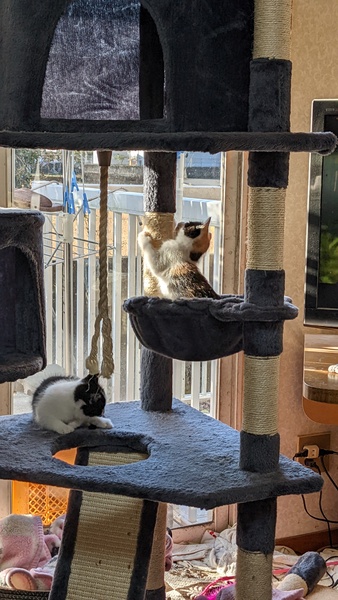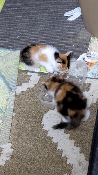 | 特徴(性格など) | 三毛猫が二匹と白黒の雌猫です。少し臆病な所がありますが、すぐに人に慣れると思います。 食事はドライ、ウェットどちらも食べます。 三匹で仲良く遊んでは寝て、また遊ぶ。おてんば姫達です。 |