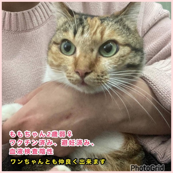 | 里親募集する理由 | 大学構内で保護され、臨月だったので子猫を産みました。 仔猫は里親様に迎えられました。 母猫ももちゃんを幸せにしてくださる方お願い致します。 |