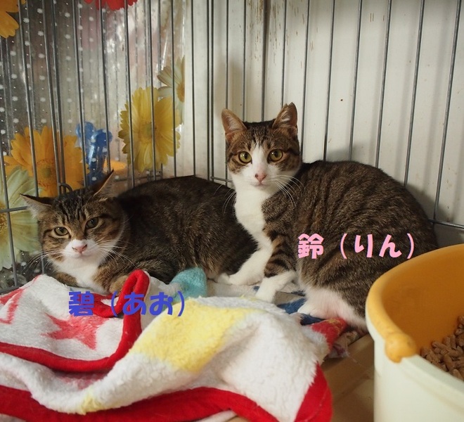 | 特徴(性格など) | 2匹ともキジ白で、男の子が碧(あお)ちゃん、女の子が鈴(りん)ちゃんです。 とても大人しくてよい子です。 最初は緊張していましたが、ずいぶん馴れてきました。 当初リリース予定だったので、ウイルスチェック(エイズ・白血病)は行っていませんが、健康状態は良好です。 |