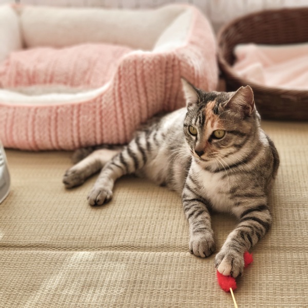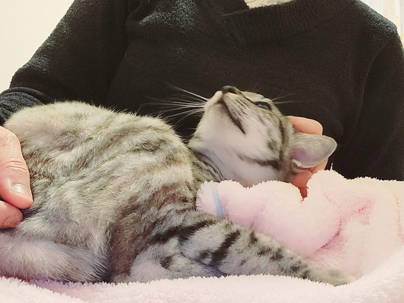 | 特徴(性格など) | すりすり、ゴロゴロ 抱っこされると ブゥブゥ~ 甘えます。 大人しく爪切りもさせてくれるので助かります(^-^) 隣部屋にいる保護猫お姉ちゃんに ワイヤーネットの仕切り越しにシャー言われると シュンとしますが 小さい事は気にしない♪と 立ち直りが早く マイペースでオモチャで遊び始めます(笑) |