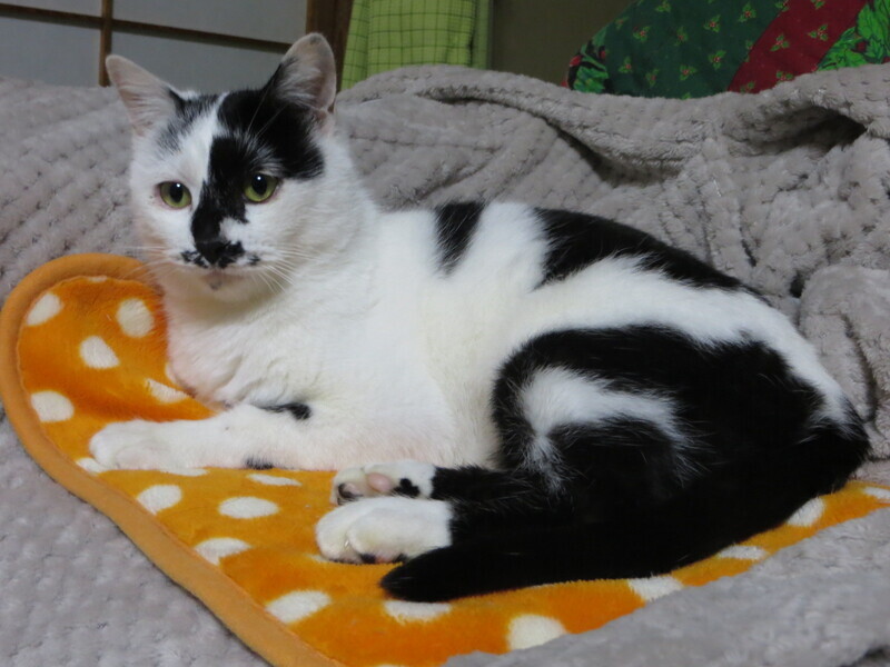| 特徴(性格など) | ご近所で見ていた方の話では、春は子猫であったとのことで、推定で生後8ヶ月としました。 12/2 不妊手術を済ませました。 FIV、FeLV 血液検査済み。 → FIV・・・陽性、FeLV・・・陰性、の結果が出ました。 FIVにご理解のある方にお願いいたします。 内臓機能その他の血液検査では、正常値範囲で健康です。 ノミ・ダニ、腸内寄生虫等、駆虫済み。 食欲たいへん旺盛で元気に過ごしています。 とても甘えんぼうで、いつも人に体をスリスリしてきます。 保護から一週間で、自分から人の膝の上に乗ってくるようになりました。 その翌週にはダッコしても落ち着いていてくれるようになりました。 頭やのどを撫でてあげると、目を細めてずっと心地よさそうにしています。 うちの先住猫と室内犬にも数日で慣れて平然としているので、おおらかな落ち着いた性格と思います。 トイレは上手にできています。 |