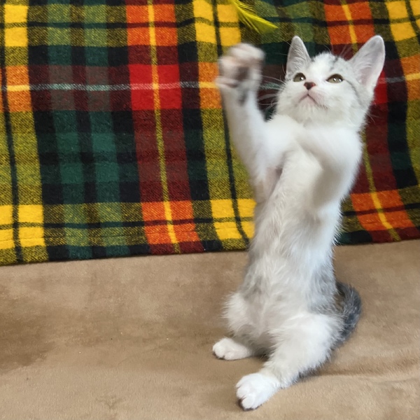 | 特徴(性格など) | やんちゃで遊ぶの大好き、元気な性格のチーズ君です。 色素の薄いグレーと白の毛並みがおしゃれで、塩顔イケメンなお顔立ち。 好奇心旺盛で人間はもちろん他の猫や犬にも物怖じしません。 多頭飼育は向いてそうな性格です。 運動神経も良く兄妹猫と一緒に元気いっぱい走り回っています。 遊び好きなので沢山遊んでいただけるおうち、お留守番が長すぎる・多すぎると子猫なので心配だと思います |