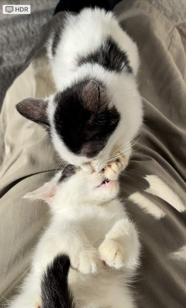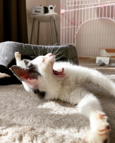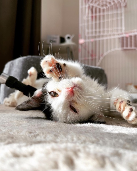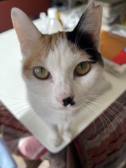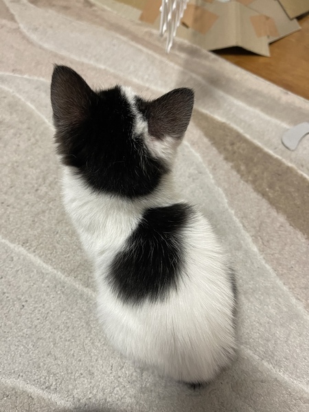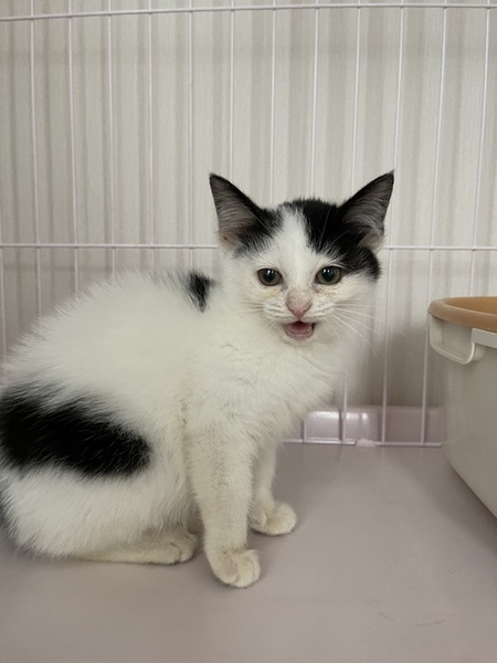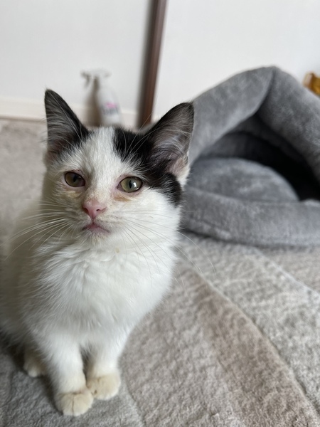 | 特徴(性格など) | 白に黒いブチがあります。 市営団地の敷地内でひっそり産まれた姉妹です。 寒く冷たい風の吹いている日に保護しました。 (保健所に飼い主不在確認済み) 保護してそのまま病院へ。 猫風邪を引いていたので、インターキャット、抗生剤、点眼で治療しました。 猫風邪を引いていたにも関わらず、食欲もあり下痢もしていませんでした。 日に日に元気になりお転婆さんになっています。 いつもちょこんと傍らに座って「遊ぼう!」と誘ってくるかわいい子です。 仲の良い姉妹なので、できたら2匹の里親さんを希望しています。 |