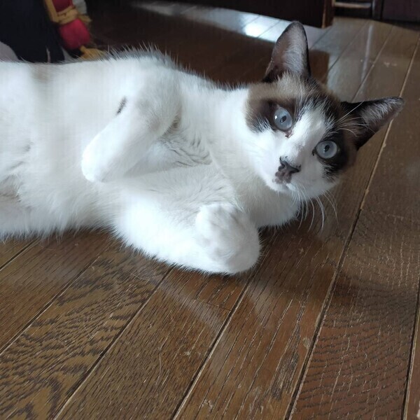 | 特徴(性格など) | とても人懐っこく甘えん坊で抱っこ好き。 足下にスリスリ後をついて歩きます。 綺麗なブルーアイで可愛いちょび髭の男の子です。 |