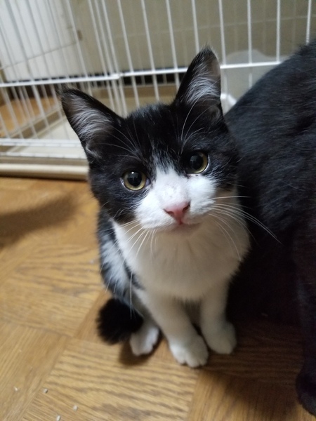 | 特徴(性格など) | 白黒の綺麗なハチワレです。少し毛がふわふわしています。 最初は臆病ですが、慣れてくると元気に遊びます。 |