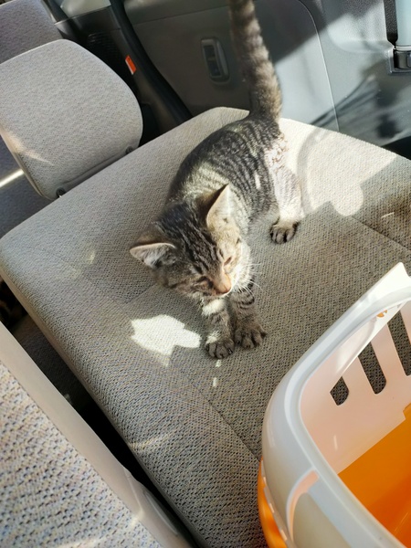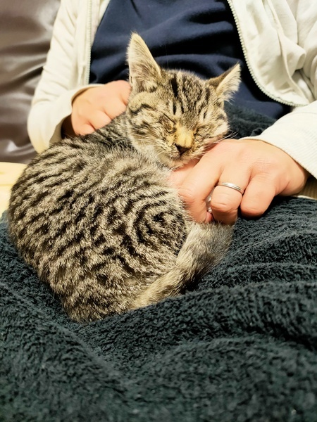 | 特徴(性格など) | きれいなキジトラ柄仔猫です。 2023.01.05に保護しました。 兄弟猫が一緒にいましたが、残念ながら亡くなっていました。 とても甘えん坊で寂しがり屋です。 よく食べ、よく寝て、よく遊びます。 ヤンチャな面もでてきました! ※先住猫がいるため、別部屋ケージ内で隔離しています。 一日に複数回、部屋の中で自由に遊ぶ時間を作っています。 2023.01.06に病院受診。 歯の生え方から推定2〜3か月、 体重1キロで、かなり痩せていました。 くしゃみ、メヤニ、鼻水、結膜炎、肛門のただれ、回虫が検出。 回虫は薬を塗布していただき、 風邪症状、肛門のただれは、内服薬、点眼点鼻薬を1週間行いました。 2023.01.14再受診 風邪症状、肛門のただれ、結膜炎は回復しました。 体重も保護時は1キロでしたが1週間で400g増え、とてもヤンチャで元気です。 回虫は2回目の検査では検出しませんでしたが、まだ完全に駆除できたかは分からないため引き続き隔離が必要との事で、引き続き隔離中です。 |