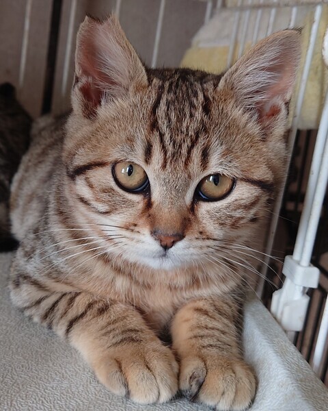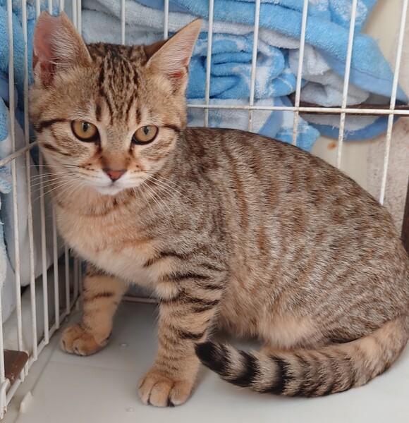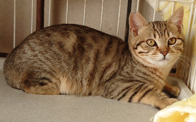 | 特徴(性格など) | キジトラ系の茶色で洋猫さんの血が 混ざっているようで綺麗な毛色です 臆病な性格ですが攻撃性はありません 食欲旺盛 元気です |