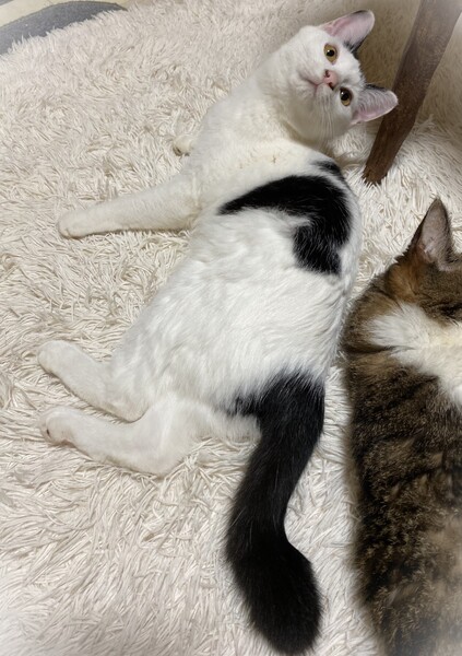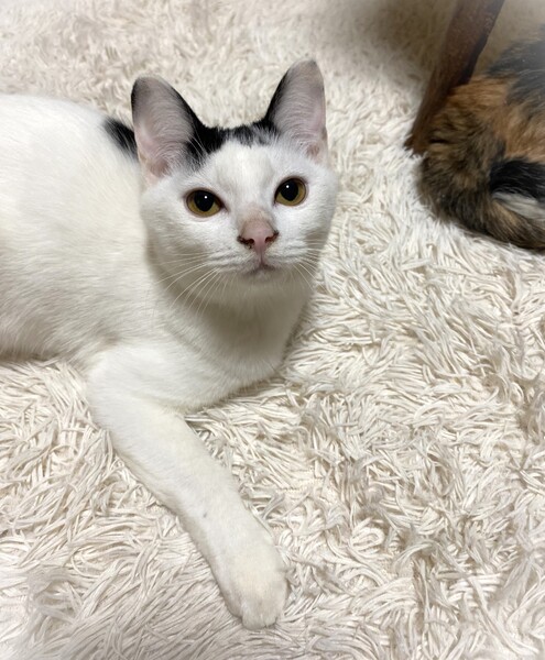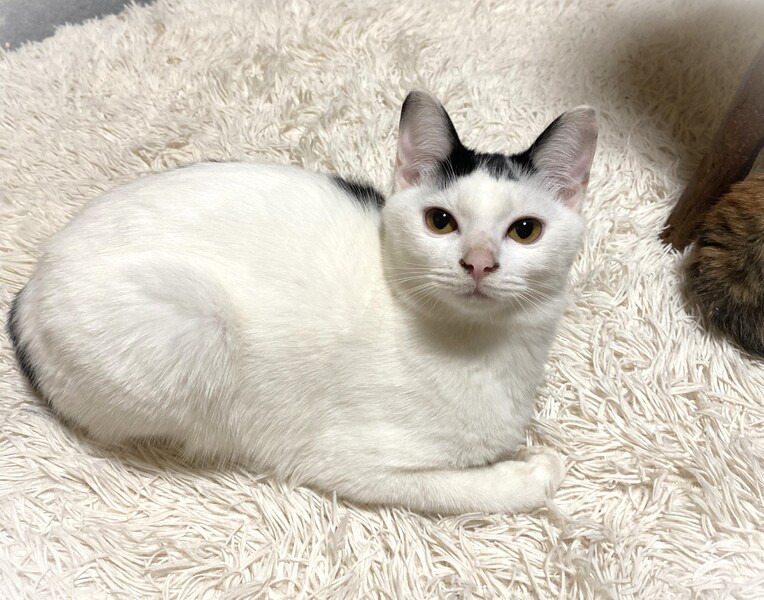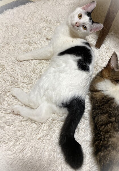 | 特徴(性格など) | 短く切りそろえた前髪・ほんの少し短いしっぽ・ちょっとだけ長めの被毛の影響で全体的にまるこい印象 白黒女の子 環境に慣れるま時間が必要です。 元々やんちゃで遊び好き。 カサカサ音が好きで、お気に入りのペットボトルのキャップや小さいキーホルダーなんかを口にくわえたまま部屋中を移動して遊んでいます。 くりくりの目をしていますが、よく渋い表情をしていたりして見ていて楽しい子です。 |
