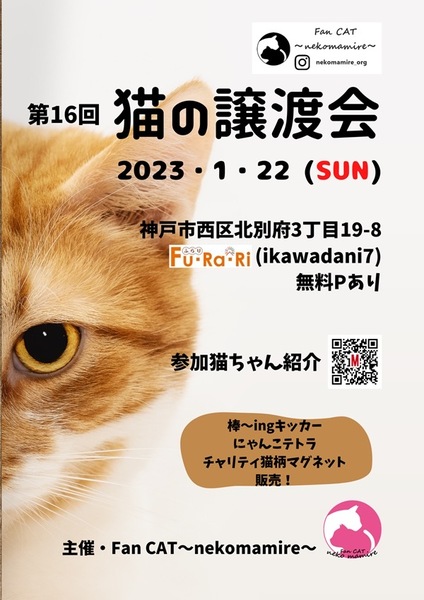 | 譲渡費用(医療費、交通費など) | 医療費の一部として(ワクチン、ノミダニ駆除、レントゲン、エイズ白血病検査、検便等) 18,000円 交通費は実費をお願いします |