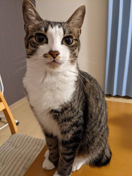 | 特徴(性格など) | とても美人でスリムなキジトラ雌です。好奇心いっぱいで凄く甘えんぼうです。おトイレも上手にしますし手がかかった事はありません。腎臓に砂がたまる病気、膀胱炎になったことがあります。今はカリカリに少量の総合栄養食をまぜて食事を与えていますがとても元気です。 | ||