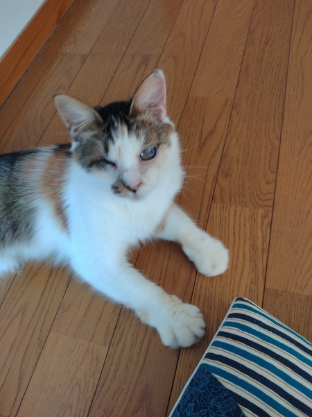 | 特徴(性格など) | 酷い猫風邪だったので目が不自由です。たまに壁などにぶつかる事もありますが、トイレもすぐに覚えましたし、音の出る物で遊ぶのが大好きです。初めは大人しく見えますが、慣れると元気に走り回ります。 目が不自由な為、口で獲物を捕まえていたようで、興奮したり嬉しかったりすると噛んでしまう時があります。噛まれないように手を離すと少し分かるようです。また寂しがり屋な所もあり、人と遊ぶのが大好きです。また猫風邪の影響で涙が出ますが治らないとの事で治療終了致しました。 |