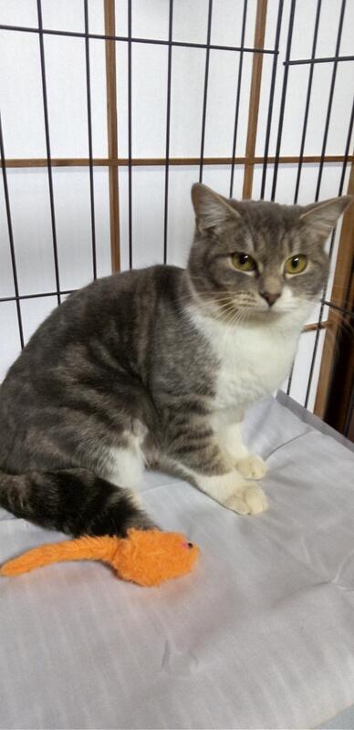 | 特徴(性格など) | サバシロ柄の女の子で生後5ヶ月くらいです 保護時の体重は2.5kg、毛がふわふわしています 目は琥珀色で口元がむりっとしていて可愛い子です 性格はまだ多少おびえたところもありますが、撫でてあげると気持ちよさそうにしています まだ幼いせいか猫じゃらしやおもちゃに興味を持っていて一生懸命遊んでいます 完全に慣れてくれると甘えん坊さんになると思います 夜は静かに寝てくれて、無駄鳴きのない良い子です フードはドライ、ウェット何でも食べてくれてトイレも問題ありません |