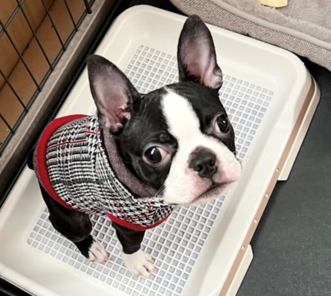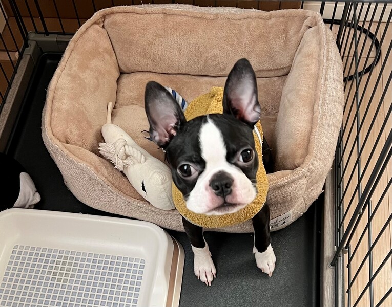 | 特徴(性格など) | ※きちんとしたブリーダーさんからお譲りいただいた仔犬です。(血統書はお渡しできません) ■サイズ 体重は現在4キロ程度ですので成犬時の予想はボストンテリアでは小さ目でライト級の6キロ前後だと思います。 ■これまで行った医療 マイクロチップ装着・混合ワクチン・狂犬病ワクチン・フィラリア・ネクスガード・フロントライン 健康診断・検便 ■性格と特徴 ・カラーは黒白でボストンカラーです。 ・誰にでもとても人懐っこく甘えたがりで懐きやすい性格です。 ・おトイレは毎回、網のガードがあるタイプできちんとします。 ・無駄吠え、チャイム吠えはありません。 ・食欲旺盛でなんでも食べます。まだ寝てる時間が多いです。パピーですので時々食糞することがあります。 ・お散歩デビュー済ですが諸事情でいろいろな経験がまだまだ少ないです。これは徐々に慣れていくと思います。 ・お外に出るのが大好きです。 ・普段は穏やかな仔ですがボストンテリアの特徴で害はありませんがたまにスイッチが入ると思いっきり走り回ります。逆にそれがとても可愛い部分ですのでその特性をご理解いただける方が希望です。 |