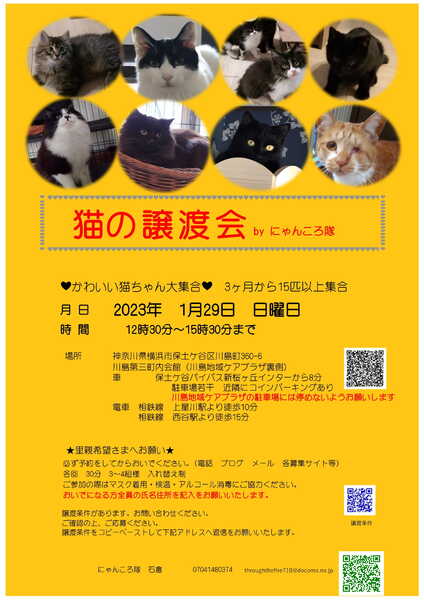 | その他(譲渡条件など) | 1/29の譲渡会(保土ケ谷区川島第三町内会館)に参加します。 詳細はイベントにてご確認ください。 https://satoya-boshu.net/event/detail.php?@DB_ID@=4459 譲渡会に参加希望の方はご予約をお願いいたします。 譲渡会にて里親さまが決まらなかった場合は個別のお見合いもお受けいたします。 お問い合わせください。 月 日 2023年1月29日 日曜日 時 間 12時30分~15時30分まで 場所 神奈川県横浜市保土ケ谷区川島町360-6 川島第三町内会館(川島地域ケアプラザ裏側) 車 保土ケ谷バイパス新桜ヶ丘インターから8分 駐車場若干 近隣にコインパーキングあり (川島地域ケアプラザの駐車場には停めないでください) 電車 相鉄線 上星川駅より徒歩12分 相鉄線 西谷駅より徒歩15分 ★里親希望さまへお願い★ 必ず予約をしてからおいでください。 各回 30分 3~4組様 譲渡条件があります。お問い合わせください。 ご確認の上、ご応募ください。 猫の譲渡は先着順ではありません。 ◆ご応募時に下記事項をお知らせください◆ 1.お名前、簡単な住所 2.先住動物の有無(ワクチン 不妊手術の有無等)と選んだ理由 3.家族構成(家族全員の年齢 関係 お仕事等) 4.住宅環境(一戸建て 分譲マンション 一戸建て賃貸 賃貸マンションペット可) 5.留守番の時間 6.下記の①~⑧までの同意 ◆応募者様へのお願い◆ ①一生涯、家族の一員としてくださる事(猫は20年生きます) ②完全室内飼いでお願いします。 (脱走防止対策をお願いします。ケージ 脱走防止扉 玄関窓等) ③不妊手術及び毎年のワクチン接種など健康管理 (不妊手術済のご連絡は必須) ④家族全員の同意があること ⑤ペット可住宅にお住まいであること。 (ペット不可にお住まいの方には譲渡できません) ⑥身分証明の提示及び誓約書を記入していただきます。 ⑦譲渡後の近況報告をしていただける方 ⑧譲渡費用等をご負担できる方 (初期医療行為は済ませてお届けします) 猫が小さい場合はお留守番の短い家を希望します。 ケージのご用意をお願いいたします。 申し訳ありませんが先住動物さんが4匹以上のご家庭はお断りさせていただいております。 無職 学生 未成年の方からの申込は受け付けておりません。 ご家族に未就学児のいるお家及び高齢者の方は要相談 2匹一緒を優先させていただきます。 双方の条件が合った場合は譲渡会又は保護先にお見合にきていだだき成立後に自宅室内へお届けいたします。 この時期なので近くに方を優先させていただく事もあります。 ご応募まってます♪ にゃんころ隊 http://nyankorotai.blog.fc2.com/ |
