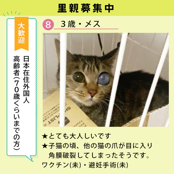 | 特徴(性格など) | 大人しいです。 人間には慣れており、人懐こいです。 小さい頃に他の猫の爪が目に入ってしまい、左目が角膜破裂してしまったとのことです。 |