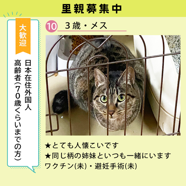 | 里親募集する理由 | 知り合いからの依頼で募集しています。 ハイツの一室で飼われていた保護猫ですが、事情がありお世話できなくなってしまったそうです。 オスとメスに分けて小さい頃からケージの中で飼われており、年齢は3歳〜4歳です。 人懐こく、人間を見ると触って欲しいと鳴いたり手を伸ばしてきたりします。 24時間狭いケージの中で過ごしており、現在はお世話もほとんどされておらず、寂しそうに鳴いています。 早く新しい家族を見つけてあげたいので、ご連絡をお待ちしております。 費用なし。 家庭訪問なし。 引き渡しの際には、身分証のご提示をお願いしております。 大阪府堺市まで引き取りに来て頂きたいです。 猫ちゃんがお好きな方であれば、外国籍の方・高齢者問いません。 |