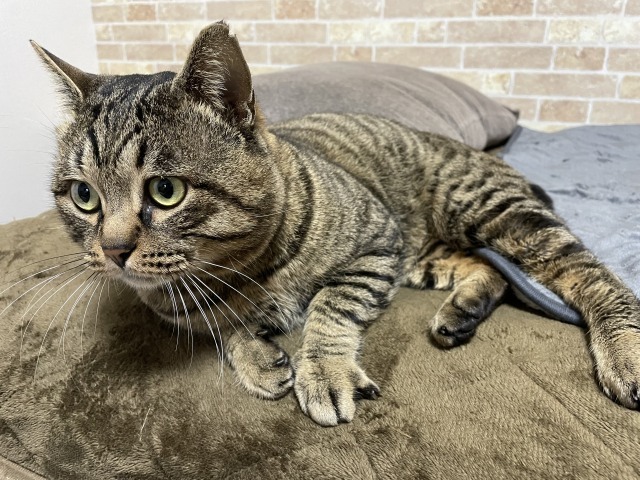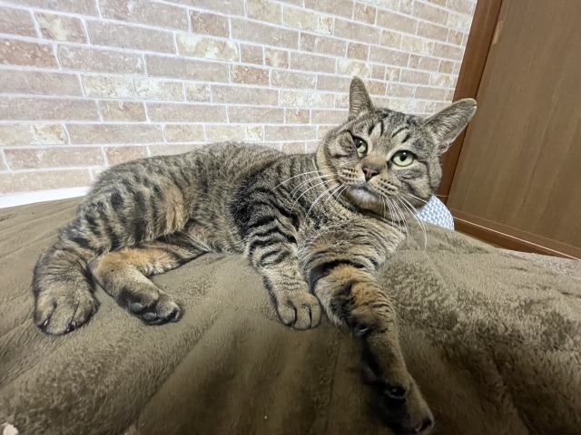 | 特徴(性格など) | おおらかで人懐っこいです 近づくだけでゴロゴロ言っています すぐにお腹を見せてくれます キジトラ、かぎしっぽ お目目ぱっちりのイケメン男子です 大きなお顔をしています よくしゃべるので、鳴いても大丈夫なお家を希望いたします エイズ・白血病陽性 発症しておらず元気です ノミダニ駆除済み 検便済み(寄生虫なし) 3種混合ワクチン1回目済み 外耳炎の治療済み 去勢手術は、体に負担がかかるため、できるだけしないほうが良いと病院で言われました |