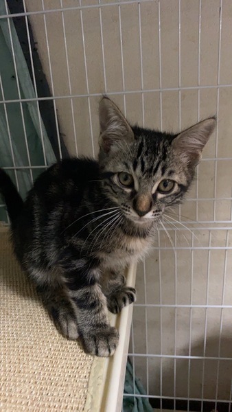 | 特徴(性格など) | キジトラ クラシックダビー 人懐っこく、元気です。 スリゴロです。 しらす、ジル♂、ししゃも♀と兄妹です。 エイズ・白血病、共に陰性 |