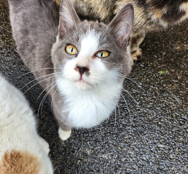 | 特徴(性格など) | ハチワレはよくご飯を食べます。灰色は、甘えん坊で引っ付いて離れません。 | ||
