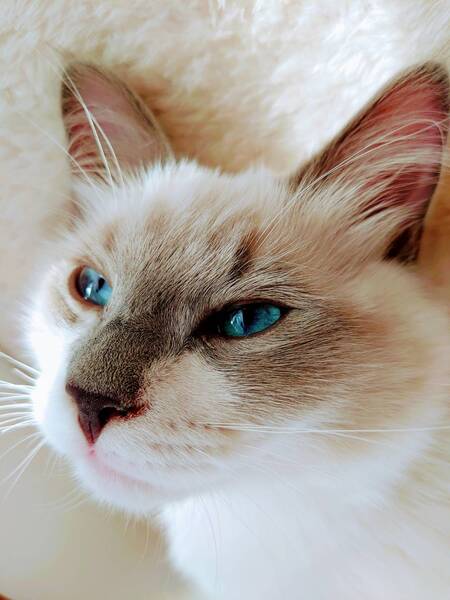| 特徴(性格など) | 生後4か月としては少し小さめですが、とてもやんちゃで元気な男の子です。 きりっとして凛々しいので、麗(レイ)君と名づけました(仮称)。 両親ともラグドールとサイベリアンのミックスで、この子も青い瞳の長毛。 ちょっと銀のスプーン「三ツ星グルメ」のラグドール(青い瞳のシールポイント・バイカラー)に似ていますが、この子の毛はシールポイント(焦げ茶)ではなく、ブルーポイント(灰色がかったベージュ)です。全身ラグドールそっくりですが、わずかに見られる額の縦線が、ラグドール風ではなく、サイベリアン・ネヴァ・マスカレード風かな・・・ 写真:1枚目から6枚目が麗君。7枚目がママ猫で、8枚目がパパ猫です。 麗君の毛質は両親猫と同じで、もつれにくくて毛玉になりにくいです。 ただし、毛玉ができにくいとは言っても、やはり毛が擦れると脇の下や足の付け根に毛玉ができることがありますし、ブラッシングは血行やリンパの流れが良くなって体に良いので、頻繁にブラッシングしてやってください。ブラッシングは猫と触れ合う機会にもなります。 万が一毛がもつれたら、ブラッシングを痛がってブラッシングを嫌がるようになります。ブラッシングできなくなって更にもつれてフェルトのように固くなると、ペット用バリカンでも刈れなくなります。この場合、麻酔をかけてハサミでカットすることになりかねません。大人しい猫でも、ハサミでカットすると皮膚を切る可能性がかなり高くて、万が一首の頸動脈などを切ると死ぬからです。 大抵の猫と同じく、麗君も撫でてもらったりマッサージしてもらったりするのが大好きです。 いろいろな猫がいる多頭飼い(猫)環境で育ったので、猫ととても仲がいいです。 多頭飼いでわいわい楽しく育っていますので、必ず猫2匹以上(5匹以下)で飼ってやってください。 ペットではなく家族として飼ってください。 特にサイベリアンは犬的な性格もあり、家族思いで、飼い主が冷たいと早死にするとも言われています。 生粋のサイベリアンではないこの子でできるかどうかはわかりませんが、サイベリアンにボール遊びを教えれば、犬のようにボールを取って来るそうです。 |