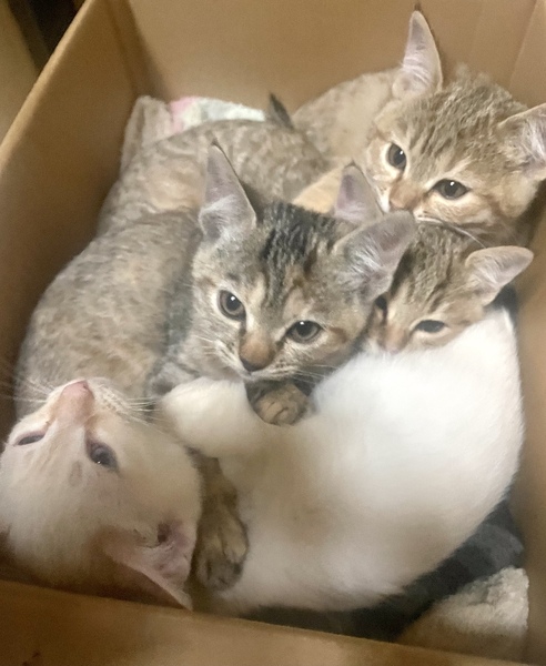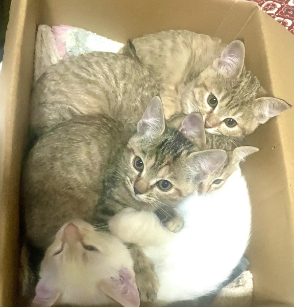 | 特徴(性格など) | 白い子猫はオス 茶キジ3匹はメスです。 みんな元気です。 |