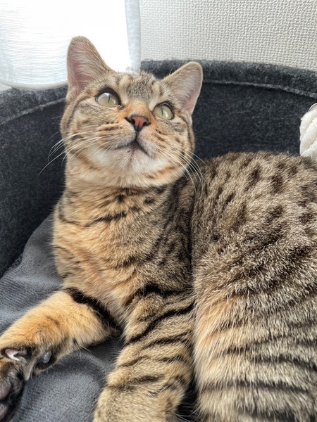 | 特徴(性格など) | キジトラ柄でもふもふな毛並み。 手足もやや短くて、全体的に丸くコロンとした可愛いフォルムです。 性格はまだ慣れないせいか、少しシャイなところがあります。 慣れると別人のように甘えてきます。 とってもおとなしくて穏やかな女の子らしい性格です。 先住猫ともすぐに仲良しになりました。 |