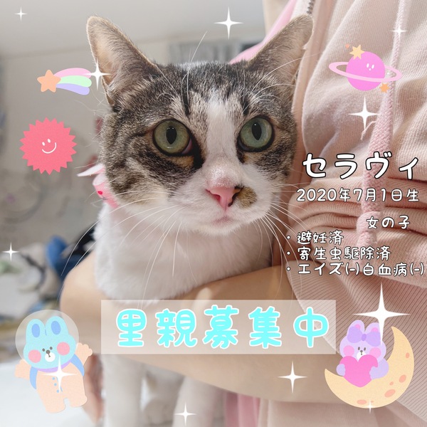| 特徴(性格など) | 宝石のようなきれいな瞳をしたとても魅力的な子です? 性格は優しくて女の子らしい性格をしています。 ・3種ワクチン2回接種済 ・寄生虫駆虫済 ・エイズ(-)白血病(-) ・避妊手術済 |