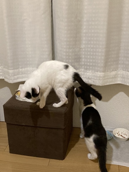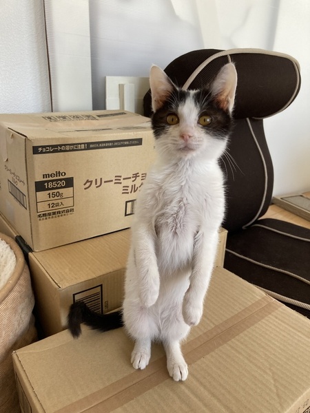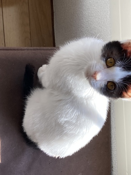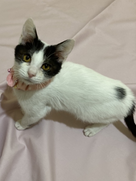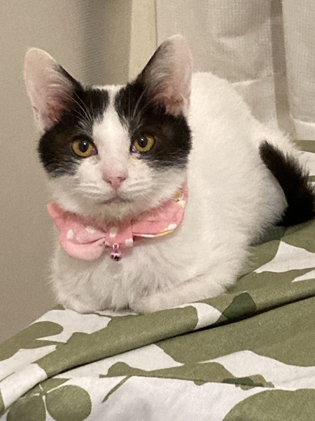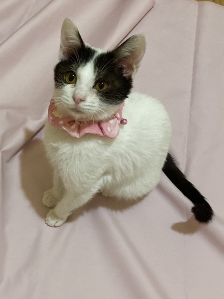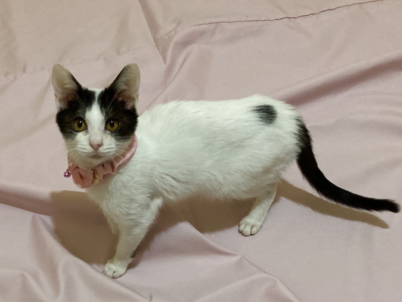 | 特徴(性格など) | 白いボディーに黒ブチ模様 しっぽが長い子です。 慎重派で怖がりさんですが 慣れればしっぽを立てて寄ってきたり お膝で寝てくれたりします。 オモチャとちゅーるが大好きです。 立ち上がってちゅーるを催促する かわいい子です。 美ニャンになりそうな可愛らしい顔立ちです。 |