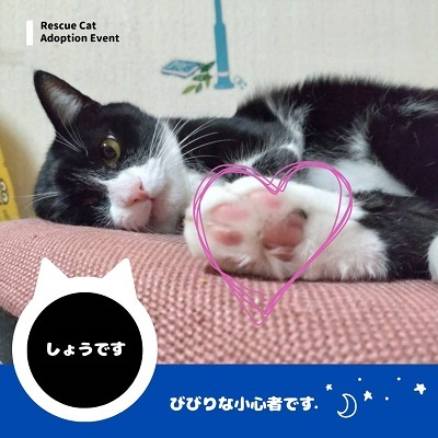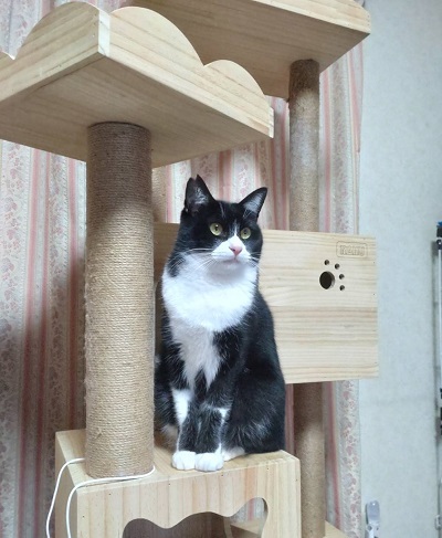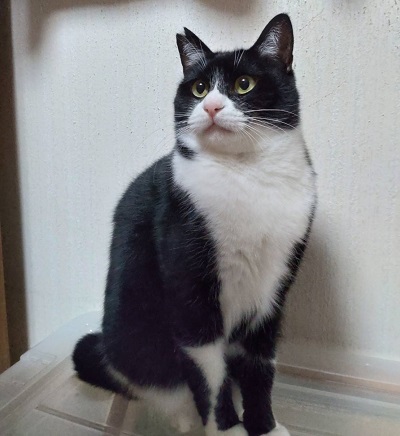 | 特徴(性格など) | 4歳くらいの男の子 男の子にしては小柄です タキシード柄で鍵しっぽ ワクチン接種、去勢手術、血液検査済 大きなお顔がチャームポイントです 初めは警戒していますが馴れてくると、そばにいたり、ツンツンしたりします。 ビビリな面もあり、隠れたりしますが、どこかチラッと見えてます |