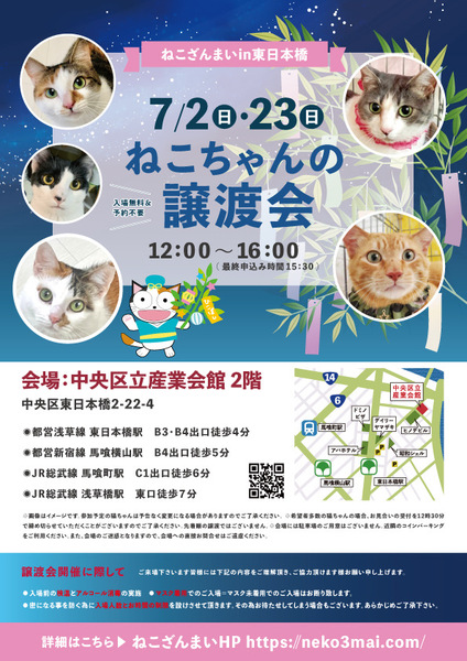 | その他(譲渡条件など) | 11:30より、2階会場入口にて受付を開始します。 受付時に入場予定時間が記入された整理券をお配り致しますので、整理券を受け取った方はお時間になりましたら2階会場入口に番号順にお並び下さい。 ※11:30より早くいらしてもお待ちいただく場所がございません。 また、近隣にお住まいの方や他階フロアのご利用者様にご迷惑となる場合がございますので、受付開始時間にあわせてお越しくださいますよう、何卒ご協力お願いいたします。 ※ねこざんまい譲渡会は、先着順で里親様を決定する譲渡会ではありません。 先に申し込みをした方を優先することもありません。 お話をして、その猫ちゃんに合ったおうちに決めさせていただいております。 12時に開場し、里親様の決定は14時以降となります。 14時以降にご入場の場合、希望の猫ちゃんが決定している可能性があります。 また1頭に対し多数のご希望をいただいた場合、早めに申し込みを締め切らせていただく場合がございますので、予めご了承下さい。 里親様決定は14時以降となります。 その後、迎え入れ準備の説明等のお時間も頂戴しますので、お時間に余裕を持ってご来場下さい。 【新型コロナウィルス感染予防対策について】 譲渡会開催に際し、ご来場下さいます皆様には以下の内容をご理解頂き、ご協力頂けます様お願い申し上げます。 ●入場前の検温とアルコール消毒の実施 ●マスク着用でのご入場=マスク未着用でのご入場はお断り致します ●入場人数の制限をさせていただきます(来場多数の場合は入れ替え制となります) ●時間と人数の制限=密になる事を防ぐ為に入場人数とお時間の制限を設けさせて頂きます その為お待たせしてしまう場合もございます ●会場利用規約により、ご来場者様の連絡先を控えさせていただきます あらかじめご了承下さい。 諸々の制限がございますが、安心・安全な譲渡会運営のためにご理解・ご協力いただきますようお願い申し上げます。 ~~~~~~~~~~~~~~~~~~~~~~~~~~~~~~ ★仔猫ご希望の里親様★ 仔猫ちゃんたちは、まだ体がしっかりしていない赤ちゃんです。 下痢だけでも数時間対応ができなかっただけ死に至る事もあります。 その為、月齢に応じたお留守番時間を設けさせていただいております。 また、子猫ちゃん(6ヶ月未満)の里親様には子猫支援金のご協力をお願い致しております。 ★猫ちゃんとのお見合いは譲渡会で!★ ねこざんまいの猫ちゃんは譲渡会でのお見合いのみとなります。 『この子はいつ譲渡会に参加するの?』『譲渡会場の場所はどこ?』などは、ねこざんまいホームページをご覧ください。 https://neko3mai.com/ ★楽しく猫ちゃんと触れ合って★ ねこざんまい譲渡会は、猫ちゃんも里親様も保護主も笑顔で過ごせる譲渡会を目指しています。 これから20年以上、楽しい時も、悲しい時もいつも傍にいてくれる大切な家族になる猫ちゃんです。 会場には沢山の猫ちゃんがいます。 1匹1匹、触れ合って猫ちゃんとお話してください。 『初めて猫ちゃんを家族に迎える方』 『先住猫ちゃんのお友達を迎える方』など トライアルの仕方や先住猫ちゃんと仲良くなるコツなど経験豊富な保護主やスタッフにお気軽にご相談ください! 猫を愛し、そして猫に愛されている猫好きスタッフと保護主がアドバイスさせていただきます。 ★里親希望のみなさまへ★ ペットではなく、家族一員としてたっぷり愛情を注いでくださるご家庭をお待ちしております。 恐れ入りますが ●学生の方、子猫・幼猫希望の60才以上の方のみのご家庭 ●脱走防止対策にご協力いただけない方 は原則譲渡を遠慮させていただいております。 ●一人暮らし・同棲(事実婚)の方 保護主の希望や猫の年齢・性格等により、ご希望に添えない場合もございます。 参加猫ちゃんは、それぞれ保護主(実際に猫ちゃんを自宅に入れ、保護をしている方)が異なります。 詳しい条件なども異なる場合がございますので、会場内で直接保護主とお話ください。 〖共通条件〗 1.終生飼育 2.完全室内飼い 3.脱走防止対策へのご協力 4.避妊去勢手術 5.契約書類へのサイン 6.定期報告 7.医療費等の負担 当日の猫ちゃんを連れて帰ることはできません。後日、保護主が里親様のご自宅までお届け致します。 その為、移動の際の猫ちゃんの負担を月齢などから考慮し、お届け地区を限定させて頂くこともございますのでご了承ください。 ご理解とご協力のほど宜しくお願い致します。 ☆よくある質問☆ ・譲渡の条件 ・ご負担頂く費用 ・譲渡会の場所等は ホームページに詳しく掲載させて頂いておりますのでご覧ください。 https://neko3mai.com/ メールでのお問い合わせはすぐにご返答出来ない場合がございますのでご了承ください。 ホームページ https://neko3mai.com/ お問い合わせ http://www.neko3mai.com/contact/form_general.html ねこざんまいブログ http://ameblo.jp/neko3mai/ |