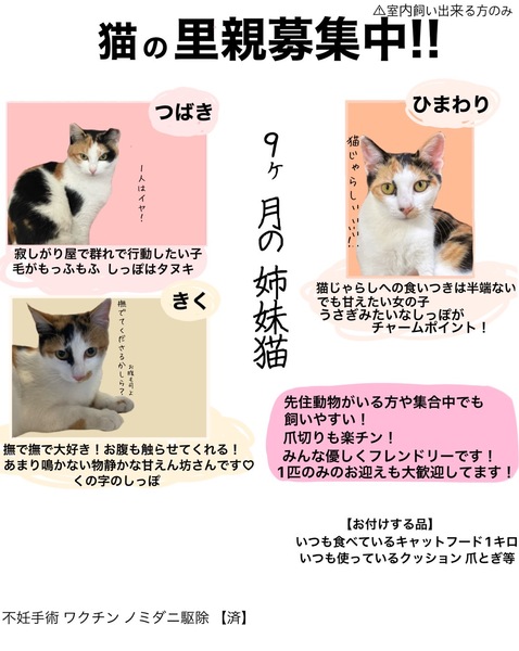 | 特徴(性格など) | 3匹とも三毛猫の♀です。 半年ほど一緒に生活をしていましたが、喧嘩などはほぼなく初めて猫を飼う方にもおすすめです。 初めての人にも、威嚇などはあまりしません。 |