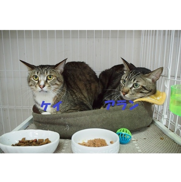 | 特徴(性格など) | ケイちゃんはキジ白のオス アランちゃんはアメショー柄のオス 仲良し兄弟です。 2匹とも人に馴れていますが、アランちゃんのほうが少しビビリです。 |