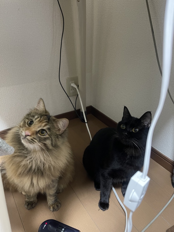 | 特徴(性格など) | ムギワラ: 抱っこはあまり好きじゃ無いですが触られるのは大好きで、ちょっと撫でただけでゴロすりしてきます。 甘えん坊です。ご飯より遊ぶことが大好きで、朝起きると枕元にオモチャが置かれてます。 しっぽの先が茶色でチャームポイントになってます。 黒: 少し臆病でお姉ちゃんに着いて回るか、常に誰かのそばにいます。 普段はあまり甘えてくることは無いですが、お腹が空いた時や眠い時は膝に乗ってきて顔をすり寄せてきます。 お腹にエンゼルマークあります。 首周りは光に当たると濃い茶色でマフラーみたいです。 ◆健康状態 ムギワラ: 問題ありません。感染症なし。 黒: 下の犬歯一本がかけてますので、歯髄が出てないか時折チェックして頂く必要があります。或いは定期的に獣医さんにチェックしてもらいたいと思います。 食欲旺盛で今のところ問題ありません。 生まれた時から体が他の子より一回り小さいです。 感染症なし。 |