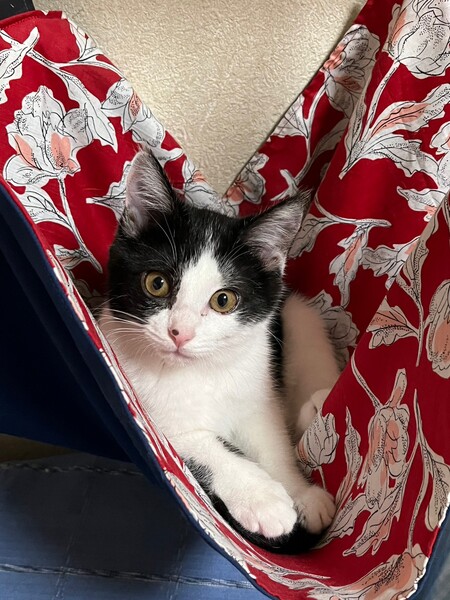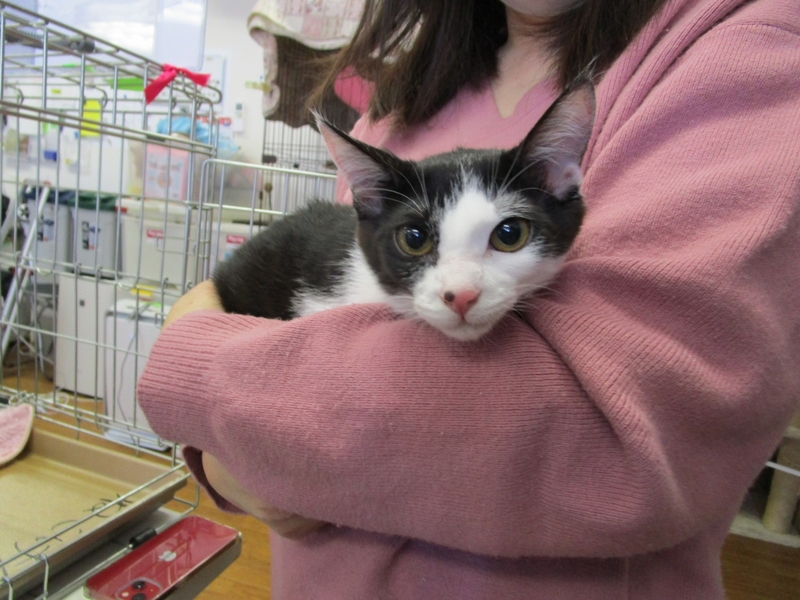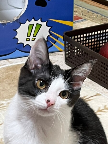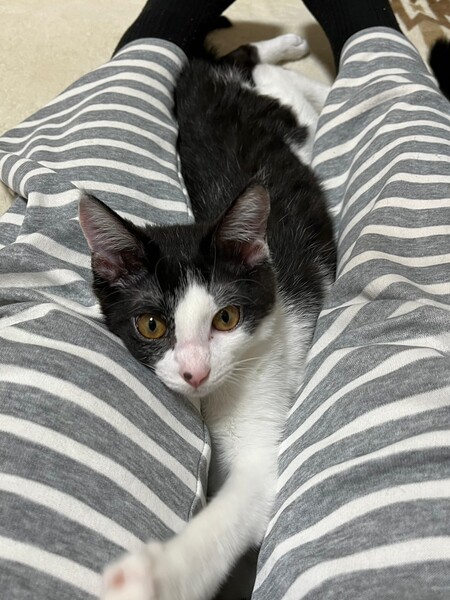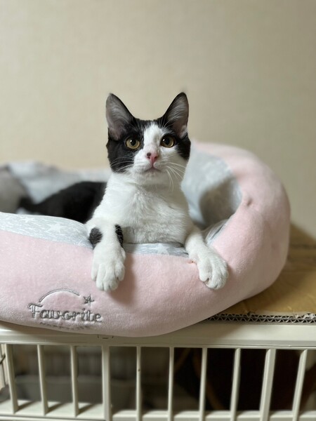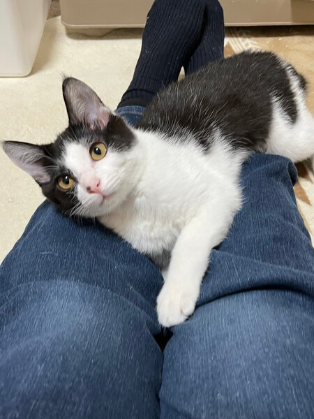 | 特徴(性格など) | 2022.9.20生まれ(推定) 毛色:白黒 ハチワレの可愛い女の子。お鼻のホクロがセクシーです。 マイペースで甘えん坊になったり、走り回ったりと忙しい子です。 ゴロゴロの爆音には癒されます 。人も猫も大好きで、気がつくと横にいます。 たまに髪をグルーミングしてくれます。 最近フミャフミャと可愛い声を聞かせてくれます。 |