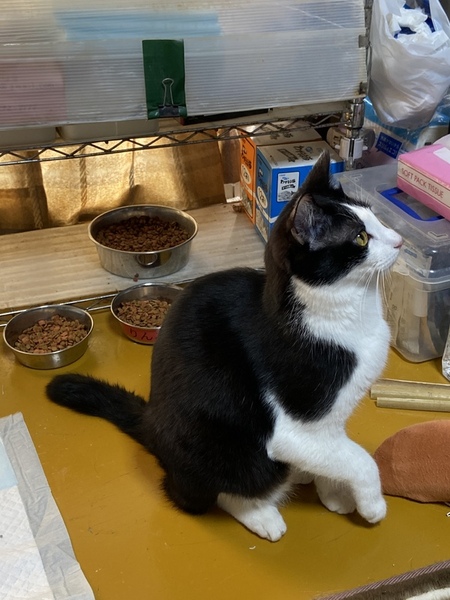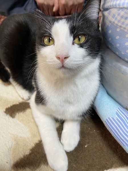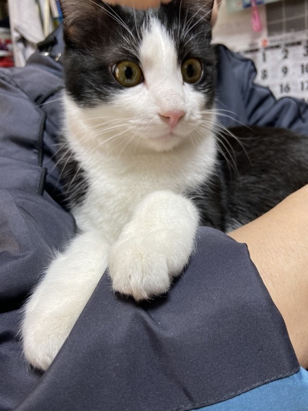 | 特徴(性格など) | 綺麗なハチワレ模様のとても人馴れしてる男の子です。 保護時、少し右前足を痛めてましたが病院にて治療済み。少し曲がってますが気になる程ではなく、普段の生活・動きなど特に問題ありません。 |