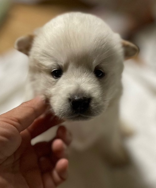 | 特徴(性格など) | 仮名「りく」オス 東温市で6兄妹で保護。 野犬の子ですが、保護が早かったため兄妹みんな人懐っこい子に成長しています。 食欲も旺盛で離乳食をモリモリ食べ、兄妹で元気に遊び、人にも「遊ぼう!」と駆け寄ってくる可愛い子達です。 兄妹は全員白くて似ていますが、りく君はその中でも一番のハンサムボーイ! 大きくなったらイケワンになること間違いなし!? |