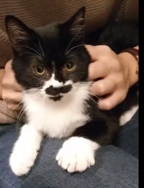 | 特徴(性格など) | 白黒でチョビ髭模様がついている元気で人懐こい女の子です。4kg弱の普通体体形です。 ピュリナワンの避妊猫用を食べていますが、味が変わっても気にしないようですし、うちに来た当初は机上の人の食事を狙ってくることもあったので、特にこだわりはなさそうです。 トイレも粗相することなくきっちりできます。うちではアイリスオーヤマの上からネコトイレと普通のシステムトイレ(屋根なし)で、木のペレットを使っています。 おもちゃと思ったもので爪を研ぐことはありますが、爪とぎを用意しておけば基本的にそちらで爪を研いでくれます。 シャワーならいやそうですが暴れたりすることもないのでシャンプーも可能です。 爪切りも、嫌がりますが一本一本やってやれば、特に問題ありません。 |