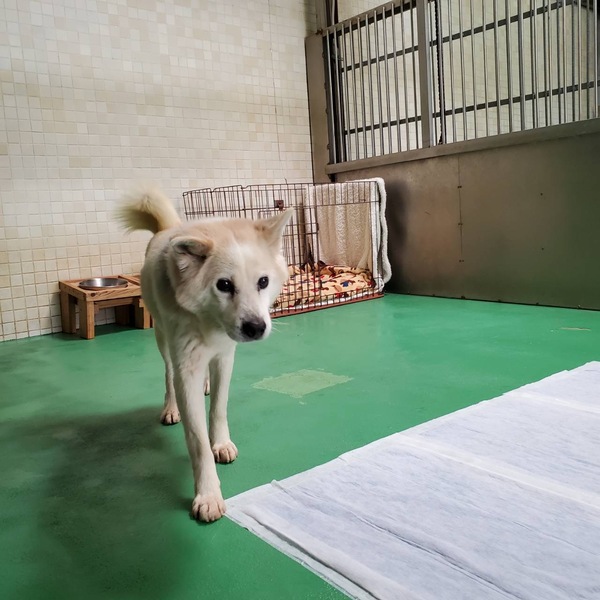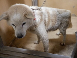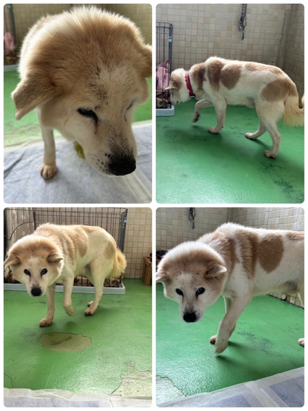 | 特徴(性格など) | ♡白茶のブチ柄中型雑種ฅ•ﻌ•ฅ 若くは無く、高齢とみられる(推定12歳以上)の可愛いクリクリおメメの男の子ฅ•ﻌ•ฅ とーっても人懐こくてまるで猫ちゃんのように頭をすり寄せて尻尾ふりふり甘えてくれて可愛い!性格花丸君♪です。 見た目の推定12歳以上、体重は12キロ位でしょうか。。今までどう生きてきたのか…?知る由もありませんが、ボロボロ首輪に錆びて切れた係留用チェーンが付いたままの状態でしたので、外に繋がれて飼われていたと思います( ; ; ) 可哀想に汚れていてブラッシングやシャンプー、口腔ケアなどをしてもらえていなかった様子( ; ; )爪は伸びているし歯石もそれなりについていますが毛並みはさほど悪くはありません。 犬舎の中を時折ウロウロと旋回するような行動をとる時もありますが殆どの時間を寝て過ごしている状態です。 優しい職員さん方が怖くないよ、今度こそは幸せになれます様にと毎日触れ合いながら、一生懸命にお世話してくださっています。 職員さんが連れ出してくれるお散歩は嬉しそう♪楽しそう♪引っ張りますが問題無く制御出来る程度です。 ※でも急な走り出しや後退りからの首輪抜け・胴輪抜けなども想定し、どんな子であっても油断は禁物で脱走、逃走には常に充分な配慮と注意が必要ですm(_ _)m この子のペースや体力をみながら寄り添う時間を取ることの出来るご家庭を希望しておりますm(_ _)m ⭐️必ず室内飼育で、譲渡後速やかに病院受診、健康診断、(血液検査、尿便検査、ノミダニ・フィラリア予防やシャンプー等)混合ワクチン接種をする事が可能な、なるべくお留守番が少ない、沢山優しくスキンシップやコミュニケーションで触れ合っていただけるご家庭。 ⭐️狂犬病予防接種、フィラリア予防や混合ワクチン実績の有無は不明です。 フィラリア陽性の可能性も有り得る事となります(>_<) ※時々咳を続けてしているので心配が募ります。 何らかの疾患があるのではと思われます。。 ⭐️高齢の為室内でのトイレトレーニングは難しいかもしれません。 未去勢で片足を上げて排尿していましたが今はお座りスタイルでしています。 何かと手がかかり大変ですが(マナーベルトやL字型のトイレ、ペットシートを用意など)覚悟と根気・理解で受け入れて下さる方。 ⭐️出来れば中型犬の飼育経験があり愛情を持って接することが出来る方、この子の体力を見つつ朝晩のお散歩や運動、コミュニケーションに充分時間をあてられる方、何卒宜しくお願い致します。 ⭐️ 今のところ吠えませんが吠えても大丈夫なご家庭。 ⭐️この子と共に過ごせる時間があとどの位残されているのか、分かりません。何か病気が有るのか無いのかも分かりません。 いずれは介護、看取りも必要になってくるでしょう。 以上の点を踏まえ、この子の置かれている状況、傷ついているであろう心をご理解の上、全て受け入れ、寄り添いながら愛情を注いでくださるご家庭で可愛がっていただきたいと願っております。 保健所収容された全ての子達は身勝手な人間による被害者であり、何も悪くありません( ; ; ) 家族の一員として生涯大切にしてくださる優しいご家庭とのご縁が結ばれ、お散歩から帰っても嫌な檻の中では無い、家族の皆さんとずっと一緒に居られるお家、この寒さにも安心して暖かに過ごせるお家が見つかります様に。幸せになれますように☆⭐︎ 首輪をしていましたし、今まで人間を信じ、人間と共に生きてきた筈です。 1日も早く温かな愛情を目一杯注がれながら、元気に幸せに生きてほしいです。人間より遙かに短い生涯です。 冷たく硬いコンクリートの上、寒くて狭い檻の中でひたすら優しい素敵な里親様を待ち続けています。 悲しい事にこの世の中、人間に飼われないと犬は生きていく事が出来ません。 捨てる飼い主、探さない飼い主、医療にかけない飼い主、虐待する飼い主…飼い主を選ぶ事も出来ません。 家族を必要としています。 最期は大切な家族の一員として、この子の全てを受け入れて下さる、優しい素敵な里親様の元で穏やかな余生を過ごしてほしいです。残るこの子の犬生を生涯大切に可愛がって下さる優しい素敵な里親様、どうかお願い致しますm(_ _)m もうこれ以上悲しく辛い目に遭わせたくありません。 本当の愛情、温もりを知ってほしい、辛かった分、寂しかった分、今後はのびのびと幸せいっぱいに愛し愛されて、生きてほしいと願っております。 家族の一員に迎え、愛情溢れるご家庭で一緒に暮らして頂けませんか。 何卒宜しくお願い致します(๑•ᴗ•๑)♡ https://dog.benesse.ne.jp/lovedog/content/?id=15698 ♦︎健康状態 ※現在食欲が落ちて口に入れてあげないとあまり食べない状態です。 ※収容当初から興奮したり食後に咳が続くことがありました。 ※ご寄付で送って頂いた栄養価の高い良質なドライフード(アカナ)と、レトルトパウチ、デビフ缶詰を1日2回食べていました。 今は流動食にしていますが口に入